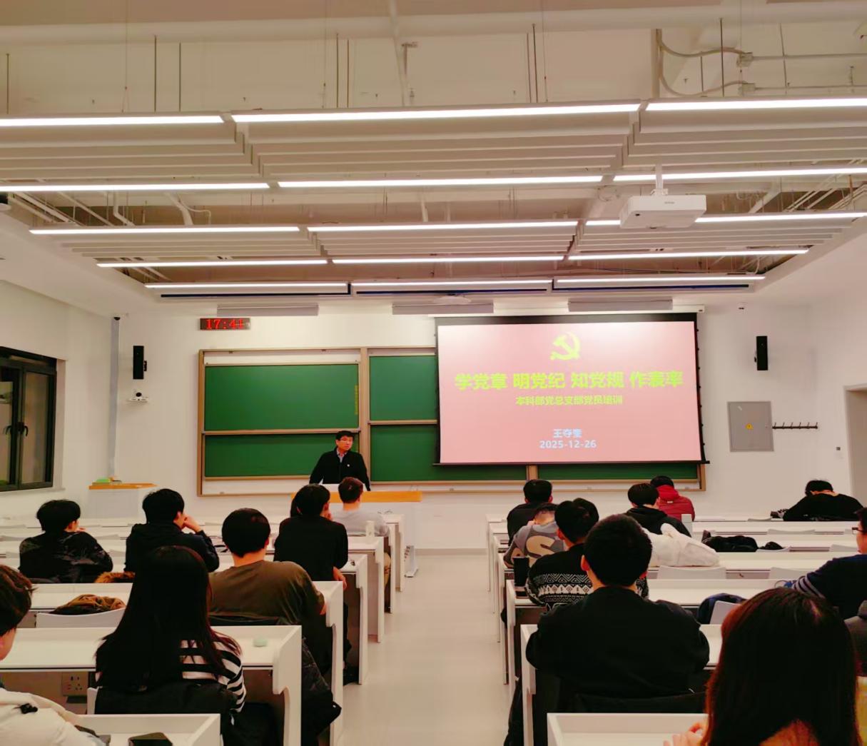 为强化学生党员教育管理,锤炼党性修养,筑牢思想根基,本科部党总支部于12月26日晚在教三楼303教室组织全体学生党员开展“学党章、明党纪、知党规、作表率”专题党课培训。本次党课由本科部党总支部副书记王夺奎老师主讲。